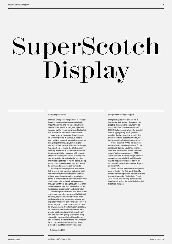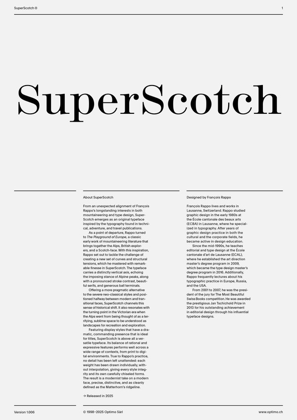 Featuring display styles that have a dramatic, commanding presence that is ideal for titles, SuperScotch is above all a versatile typeface. Its balance of rational and expressive features performs well across a wide range of contexts, from print to digital environments. True to Rappo’s practice, no detail has been left unattended: each weight has been drawn individually, without interpolation, giving every style integrity and its own carefully chiseled forms. The result is a modernist take on a modern face—precise, distinctive, and as cleanly defined as the Matterhorn’s ridgeline.